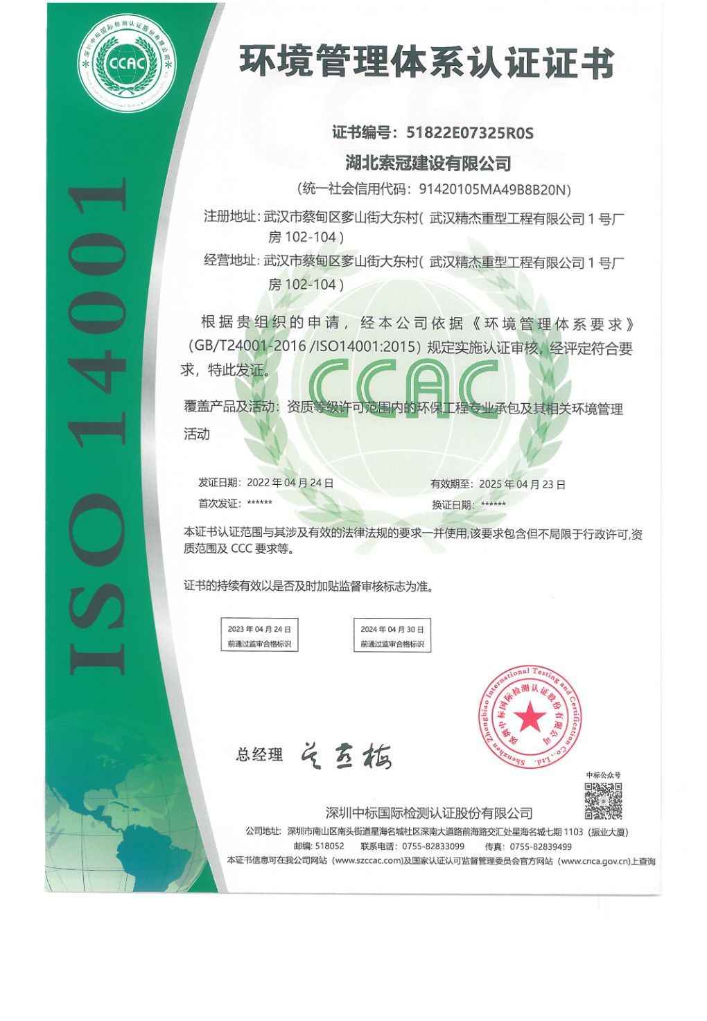 环境管理体系认证证书